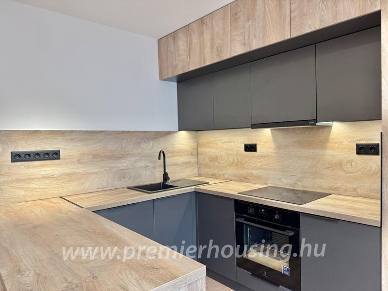 Az első emeleti lakás amerikai konyhás nappalival és két külön hálószobával rendelkezik, kialakítása átgondolt, tágas és élhető. A belső terek megalkotásakor prémium minőségű anyagokat alkalmaztak, az exkluzív, mégis időtálló életérzés jegyében. Az egyedi tervezésű, teljesen gépesített konyhabútor beépített sütővel, indukciós főzőlappal, elszívóval, hűtővel és mosogatógéppel felszerelt. A nappaliban bioetanol-látványkandalló kapott helyet, amely esztétikailag és hangulatában is különleges eleme az enteriőrnek.