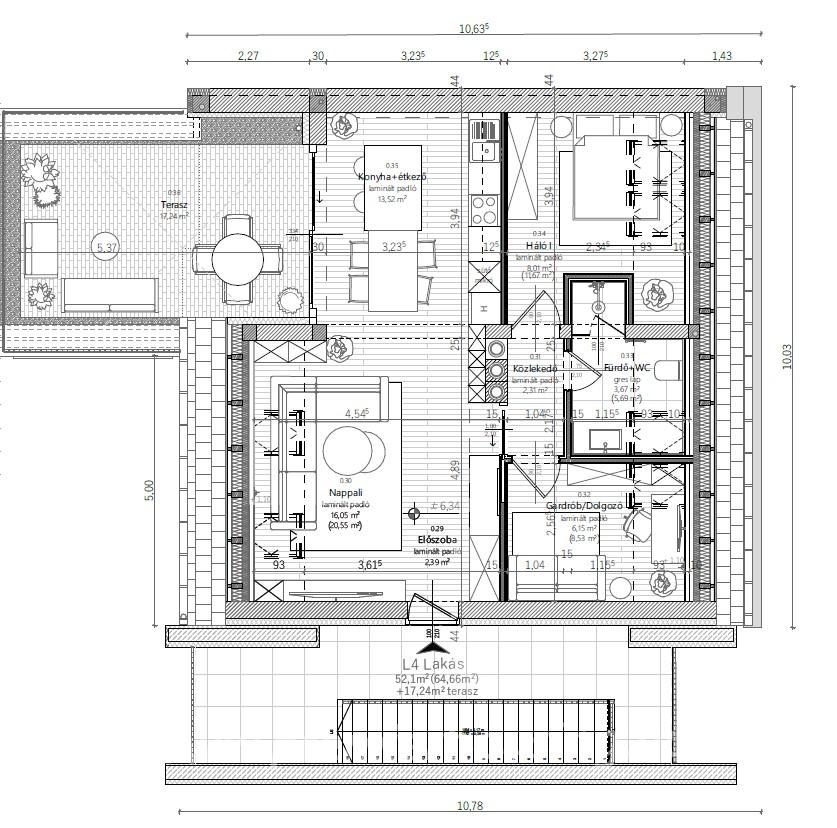 Ezen ingatlan a tetőtérben található (a tervrajzon L4 számú lakásként jelölve), összesen 52,1 m2 (bruttó 64,66 m2) alapterületű lakótérrel + 17,24 m2 panorámás nyugati tájolású terasszal rendelkezik. A lakótérben egy kényelmes konyha-étkező-nappal, egy hálószoba, egy gardróbszoba vagy dolgozó helyiség, és egy fürdőszoba + WC került kialakításra.